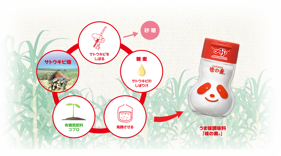 「味の素®」は、サトウキビなどの原料を発酵させて作られています。「味の素®」になるアミノ酸を取り出したあとの副生物もまた栄養の宝庫。有機質の肥料として畑に戻すことで、再びサトウキビを育むなど、 地域に豊かな実りをもたらしています。私たちはこの取り組みを“バイオサイクル”と呼んでいます。