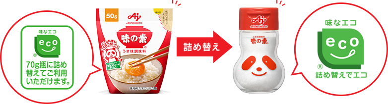 袋商品から詰め替えて、長持ちする瓶商品を繰りかえし使っていただくことで、環境負荷を抑制できます。詰め替え先(瓶)、詰め替え元(袋)の両方に、「詰め替えでエコ」を表示しています。