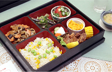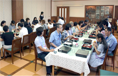 工場内の特別食堂で「エコうま」弁当を参加者、スタッフ、味の素社員が一緒になって食べました。