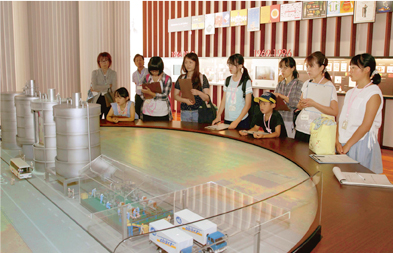 味の素グループの歴史や、うま味調味料「味の素」ができるまでの工程と発酵後にできる副生物を次の畑の恵みに活かす資源循環の仕組み(バイオサイクル)をジオラマで見学しました。