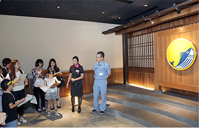 「ほんだし®」のためにいぶし分けた3種のかつお節から、顆粒ができるまで、包装されて製品になるまでを工場で見学しました。「ほんだし®」おにぎりの試食で、ほっと一息つきました。